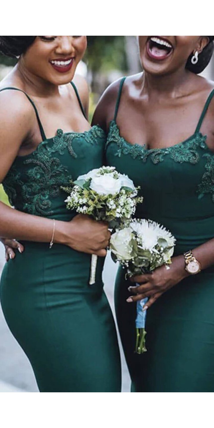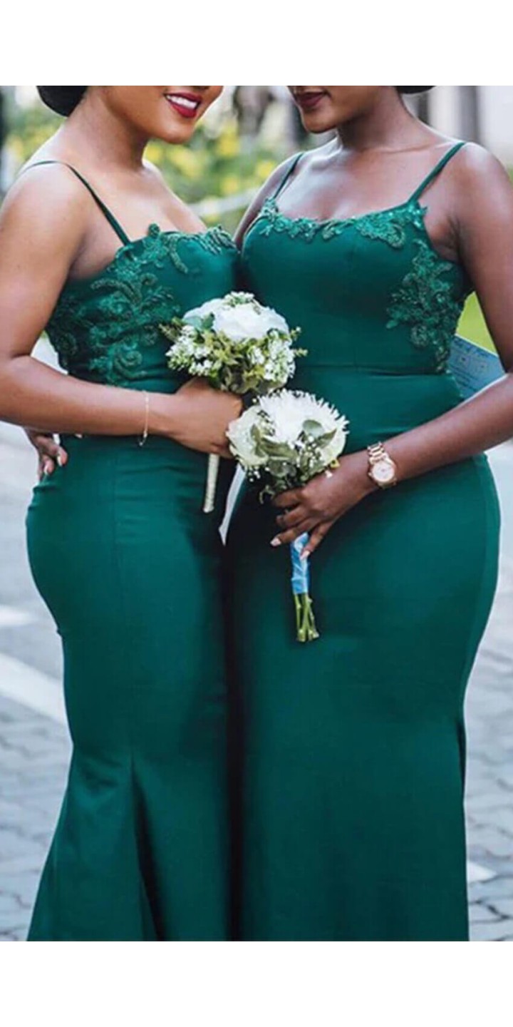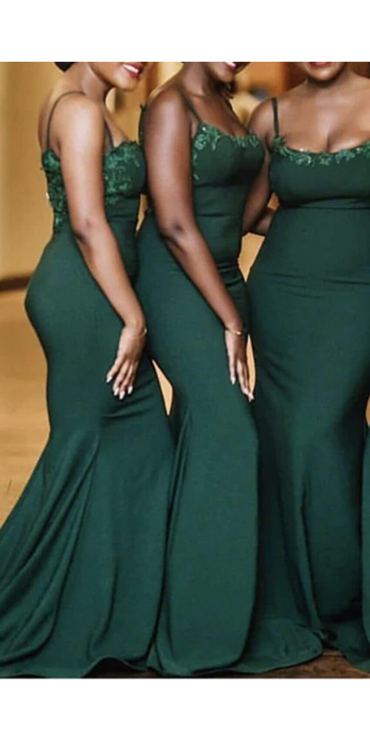 The figure-flattering mermaid silhouette features delicate spaghetti straps and an exquisite lace applique detail along the sweetheart neckline, adding a touch of romantic sophistication. The floor-length design flows gracefully into a dramatic flared hem, creating a captivating silhouette that's perfect for formal wedding celebrations. Crafted with attention to detail, this dress combines style with comfort, featuring a fitted bodice that extends through the hips before gracefully flaring out. The rich emerald green color adds a regal touch to any wedding palette. Each dress can be custom made to ensure a perfect fit. The sleek and modern design is complemented by the subtle sheen of the fabric, making it an excellent choice for both indoor and outdoor ceremonies. Perfect for bridesmaids who want to make an unforgettable impression while complementing the bride's special day.