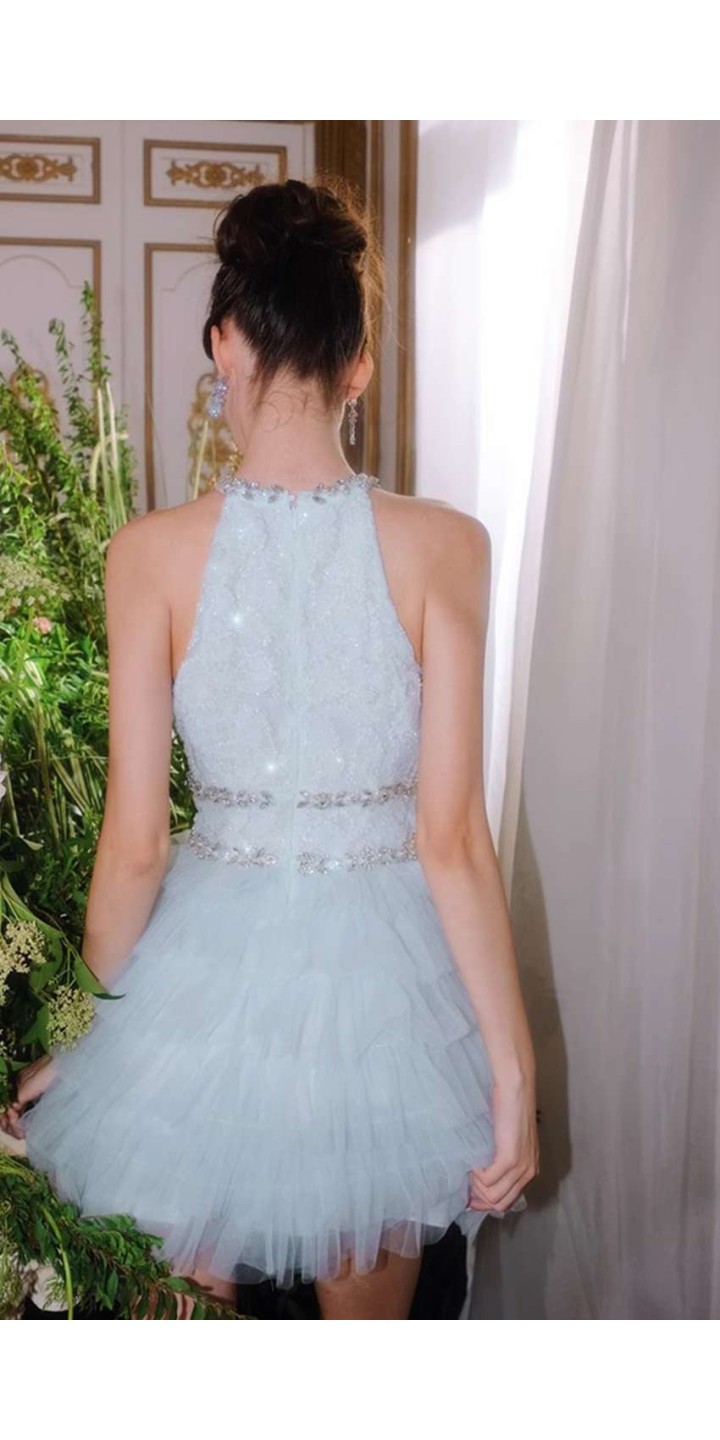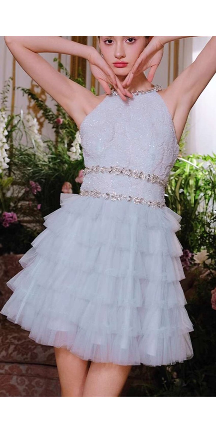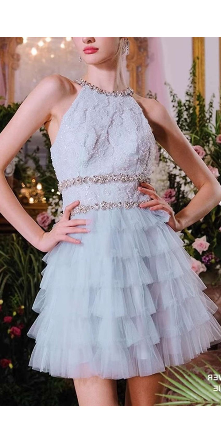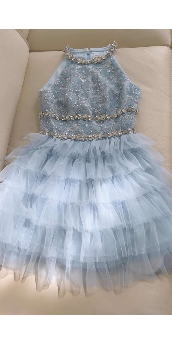 Floral Embellished Short Blue Tiered Graduation Dress KSP663
