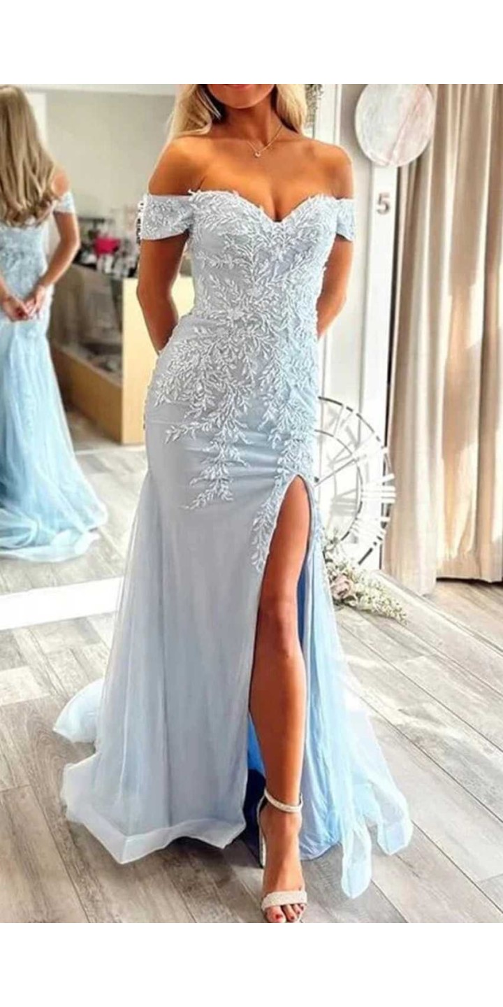 Light Blue Off The Shoulder Appliqued Mermaid Prom Dress Slit KSP688