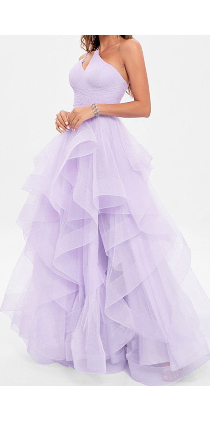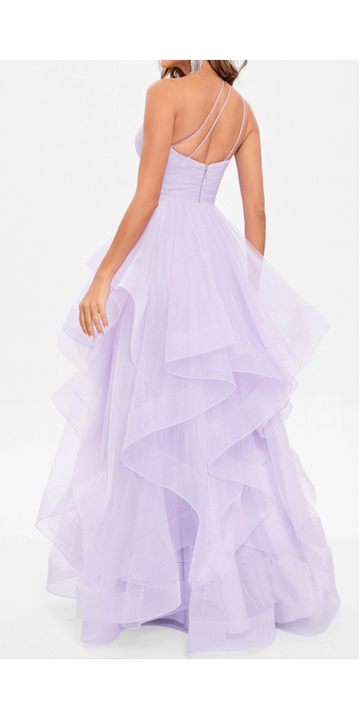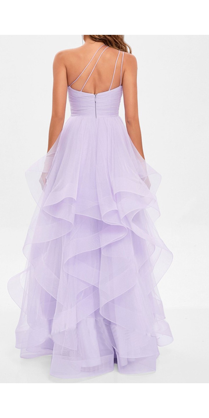 The elegant asymmetric neckline features delicate strappy details that continue to an eye-catching back design, creating a modern and sophisticated silhouette. Crafted in a dreamy lavender hue, this floor-length evening gown showcases a luxurious tulle construction that feels as ethereal as it looks.