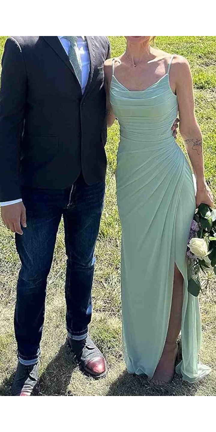 The floor-length design flows gracefully with a sophisticated side slit that adds movement and a hint of allure. The low-cut back with adjustable straps ensures a comfortable and customizable fit throughout the day or evening. Perfect for weddings, formal events, or special celebrations, this versatile dress can be dressed up with statement jewelry and heels or kept simple for a more understated look.