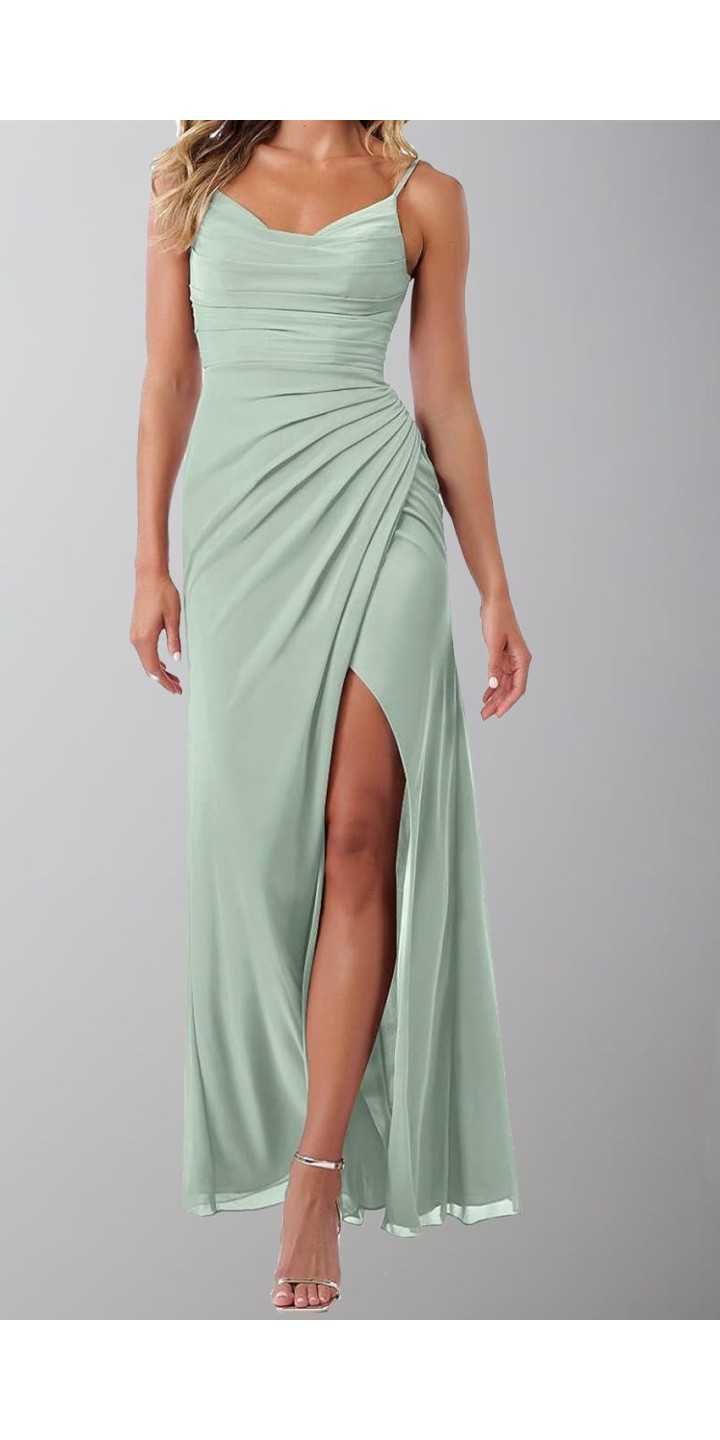 The soft sage green color is on-trend and complements a variety of skin tones, making it an ideal choice for bridesmaids or wedding guests. The elegant draping and thoughtful construction ensure you'll feel confident and beautiful from ceremony to reception.