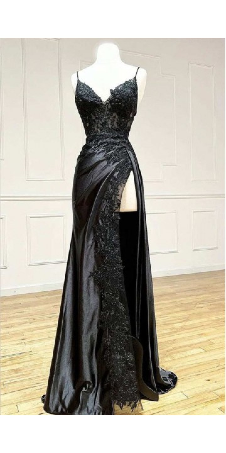 Make a grand entrance with this elegant black A-line prom dress. Featuring delicate spaghetti straps and a romantic V-neckline, this gown is adorned with intricate floral lace appliques and shimmering beadwork. The see-through bodice and asymmetric high slit add a touch of modern sexiness, while the lace-up back ensures a perfect fit. Ideal for prom, gala dinners, or any formal evening event.