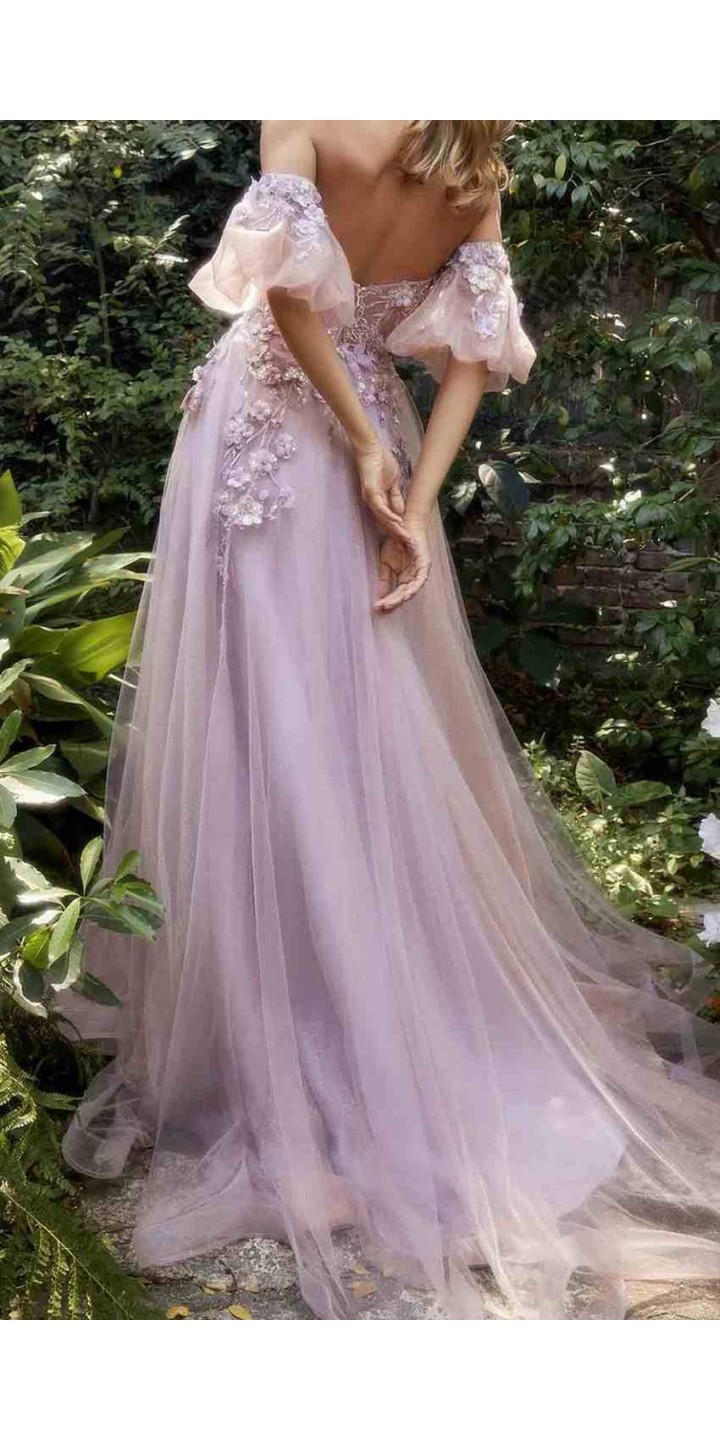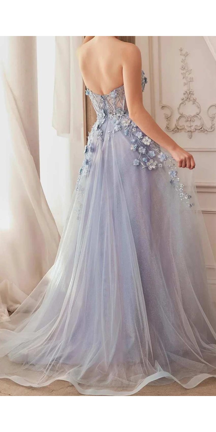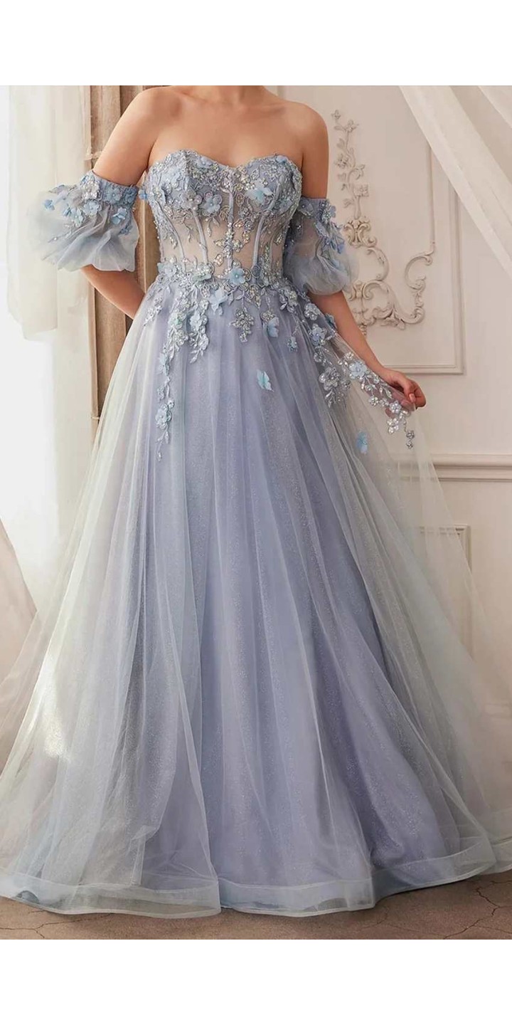 The dreamy periwinkle blue tulle creates a captivating silhouette, while delicate floral appliques cascade across the bodice and float down the voluminous skirt. The sweetheart neckline and removable puff sleeves add a touch of classic sophistication, perfectly balanced with modern charm.
