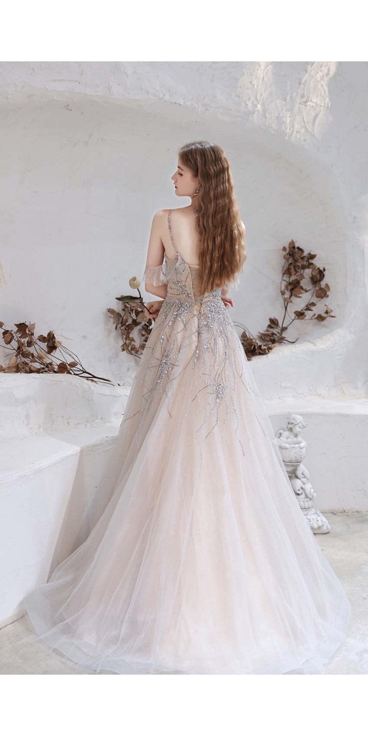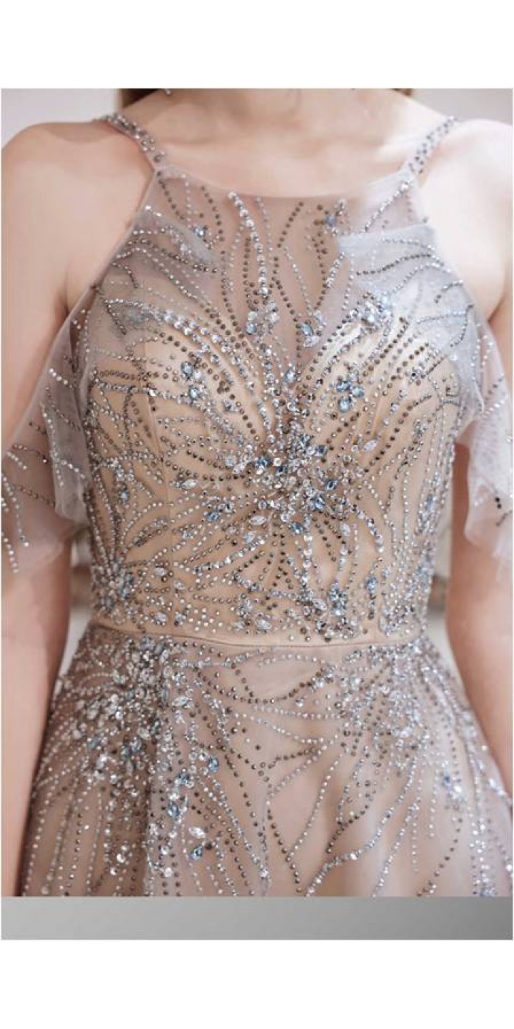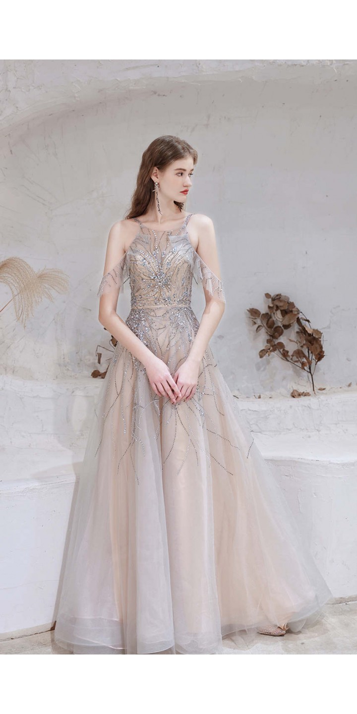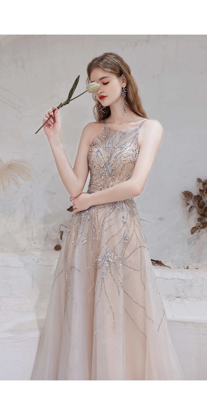 Embellished Halter Straps Long Prom Dresses With Sleeves KSP594