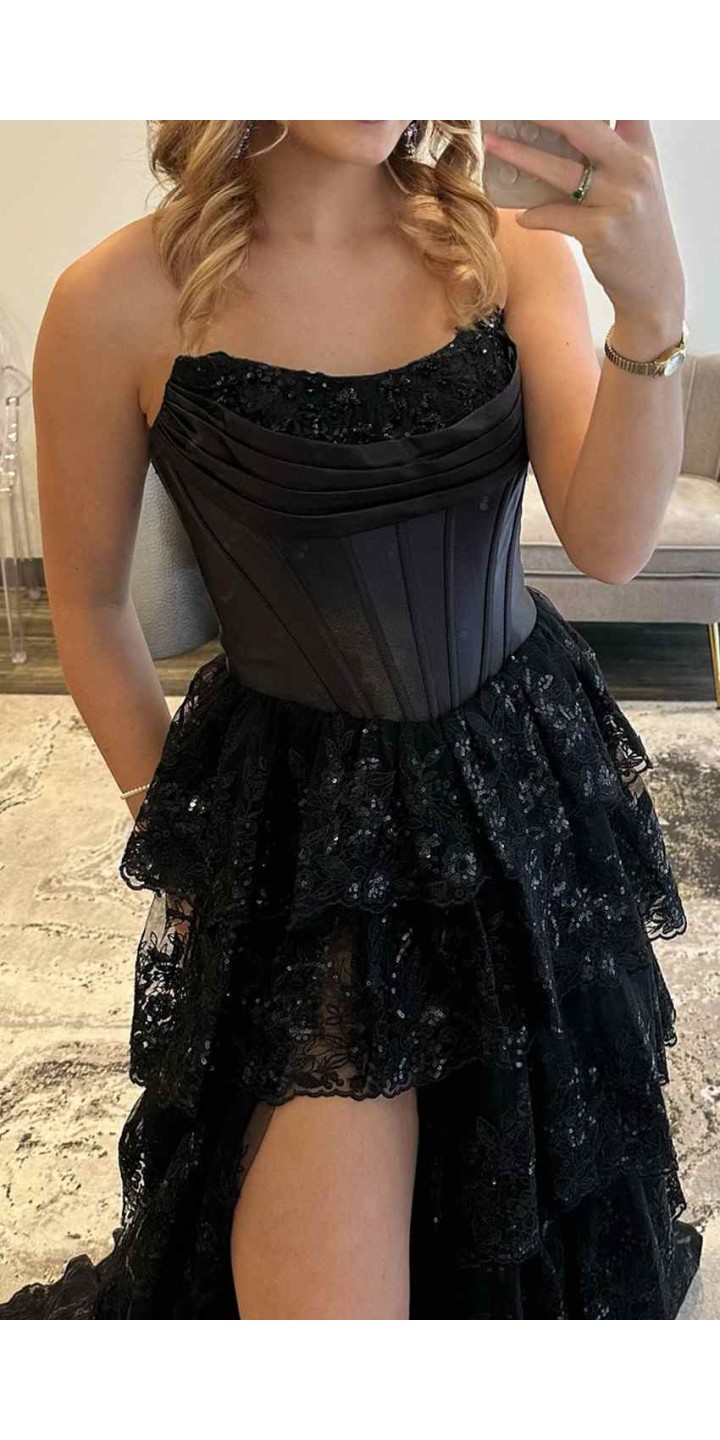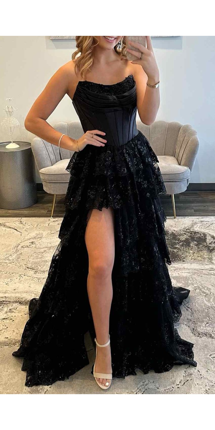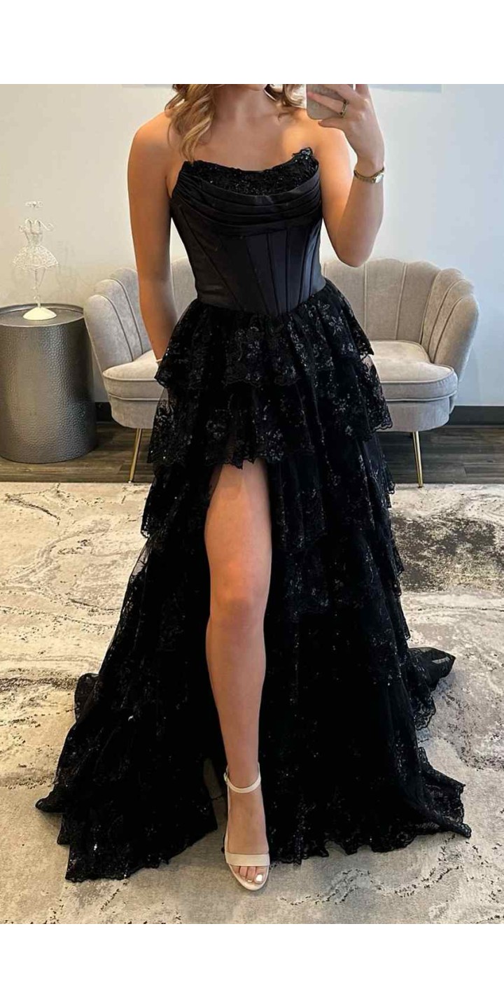 Black Strapless Corset Lace Layered Prom Dress with Slit KSP693