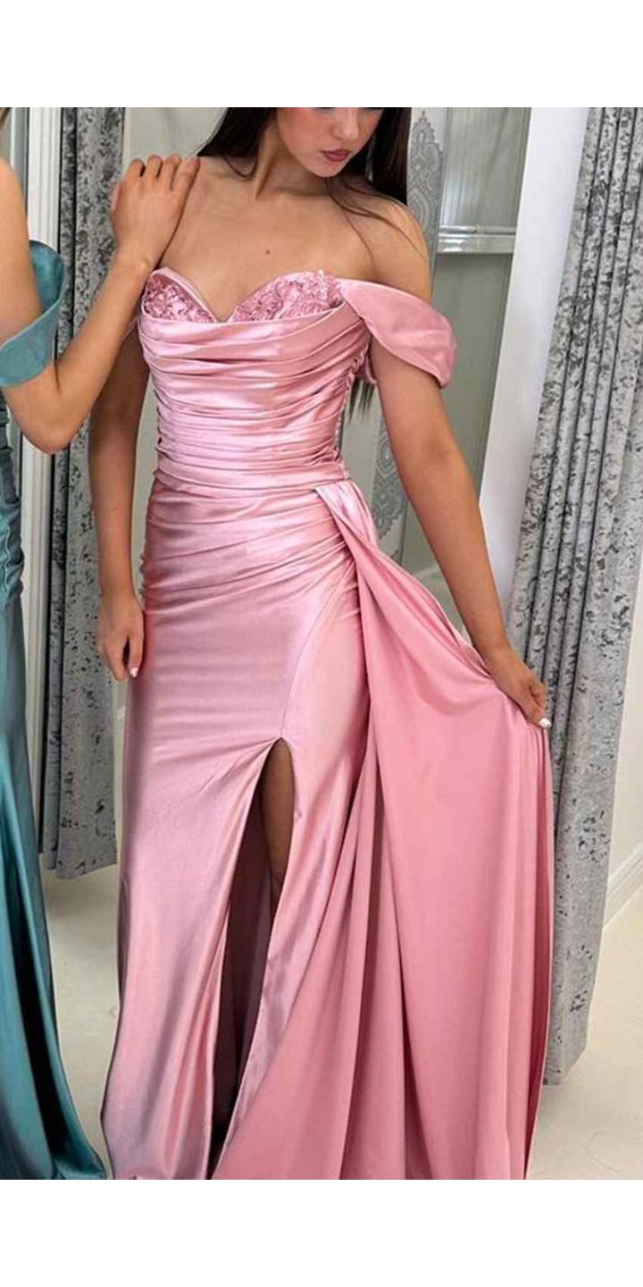 Off-Shoulder Ruched Satin Prom Dress Long with Lace Bodice KSP694