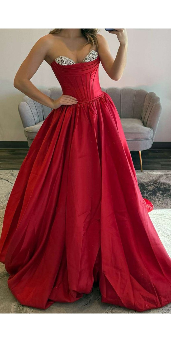 STUNNING DESIGN: Strapless ball gown featuring a crystal-embellished sweetheart neckline and fitted corset bodice, creating a glamorous silhouette;
