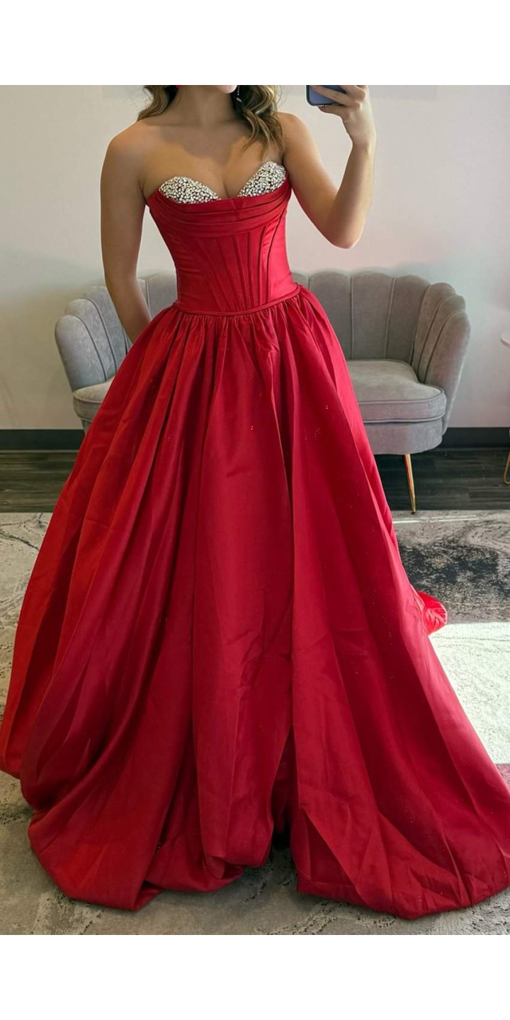 Make a stunning entrance in this breathtaking red ball gown. The dress features an expertly crafted corset bodice with a crystal-embellished sweetheart neckline that sparkles with every movement. The fitted waist flows into a dramatic full skirt crafted from luxurious red satin, creating a classic silhouette that's both timeless and elegant.